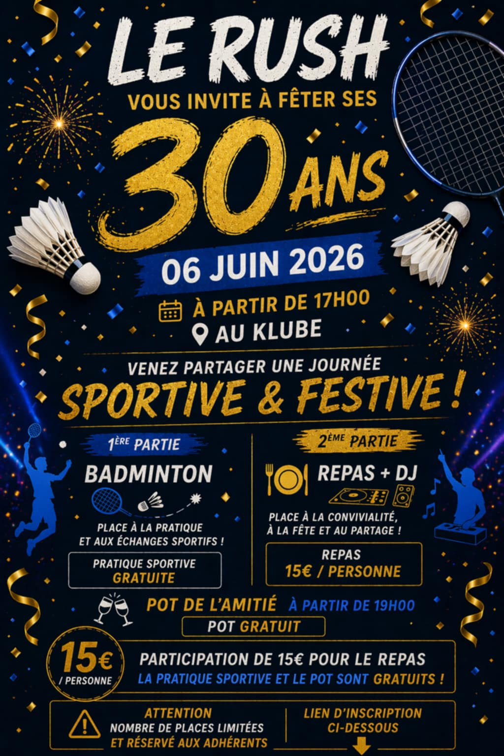 Le RUSH fête ses 30 ans et vous invite à une grande journée sportive et conviviale le samedi 6 juin 2026, à partir de 17h, au Klube.